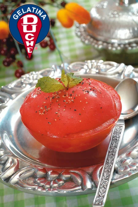 2. Calienta 4 cucharadas de pulpa de jitomate, retira del fuego y mezcla poco a poco con la grenetina previamente derretida en baño María y el resto de la pulpa para igualar temperaturas y evitar que la gelatina cuaje de golpe. Deja reposar.