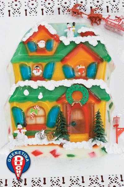 6. Una vez que cuaje la gelatina transparente de la casita, pinta la puerta, ventanas, marcos, etc., con los colorantes vegetales con que pintaste la gelatina de leche. Espera hasta que cuaje, vacía 1 ½ tazas de gelatina de leche sobre la casa y refrigera hasta que gele.