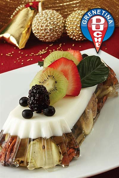 Para el áspic hidrata la grenetina Duché en la taza de agua a que esponje y disuélvela a baño maría o en el horno de microondas. Calienta el agua restante con el azúcar sin que llegua a hervir; retira y agrega la grenetina hidratada con el ácido cítrico, la esencia Duché y los frutos secos. Vierte al molde y refrigera a que cuaje. Para la gelatina de leche, hidrata la grenetina Duché como la anterior. Calienta la leche con la miel, retira antes de que hierva, añade la grenetina hidratada y la esencia Duché sabor anís; vacía al molde sobre la grenetina de leche y refrigera hasta que cuaje totalmente. Desmolda y decora al gusto. |