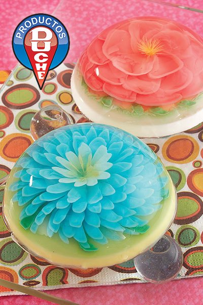 1) Carga la jeringa con gelatina amarilla, introdúcela en forma recta en el centro de la capa transparente formando los pistilos. Carga otra jeringa en el color elegido y forma pétalos dándole el tamaño deseado a la flor.