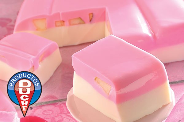 4) Añade la mezcla de peras y la grenetina disuelta. Divide en dos partes a una agrega el colorante rosa, deja semicuajar y distribuye la pera picada, deja cuajar por 15 minutos y vierte el resto de la preparación.