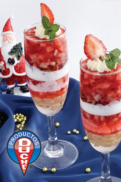 3) Vacía un poco de gelatina cristal y piñones en una copa hasta llenar la cuarta parte; deja cuajar. Vierte enseguida otro poco de gelatina cristal y fresas; deja cuajar.